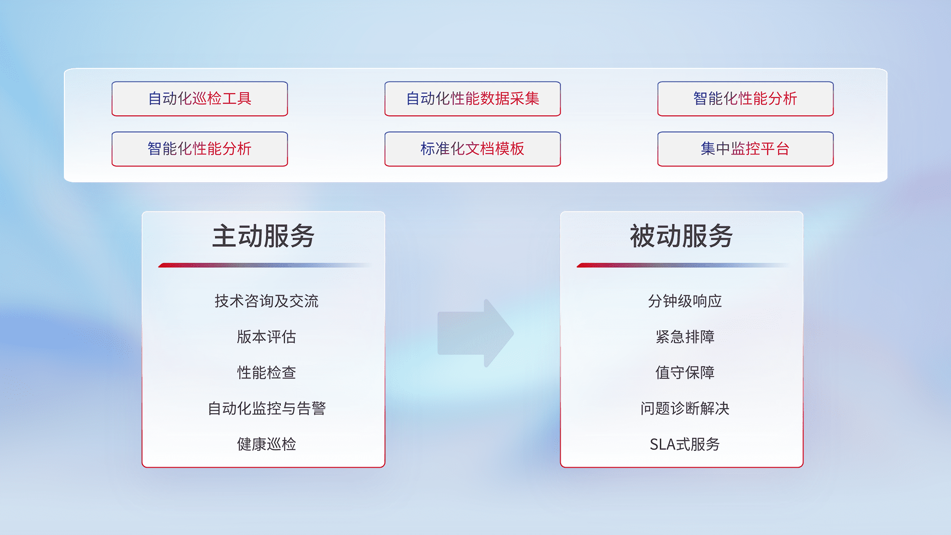 智能化工具和标准化文档,,,保障服务质量,,,,提供主动服务(包含技术咨询、、、版本评估、、性能检查、、、、自动化监控与告警、、、健康巡检)和被动服务包含(分钟级响应、、、紧急排障、、、值守保障、、问题诊断解决、、SLA服务)。。。。