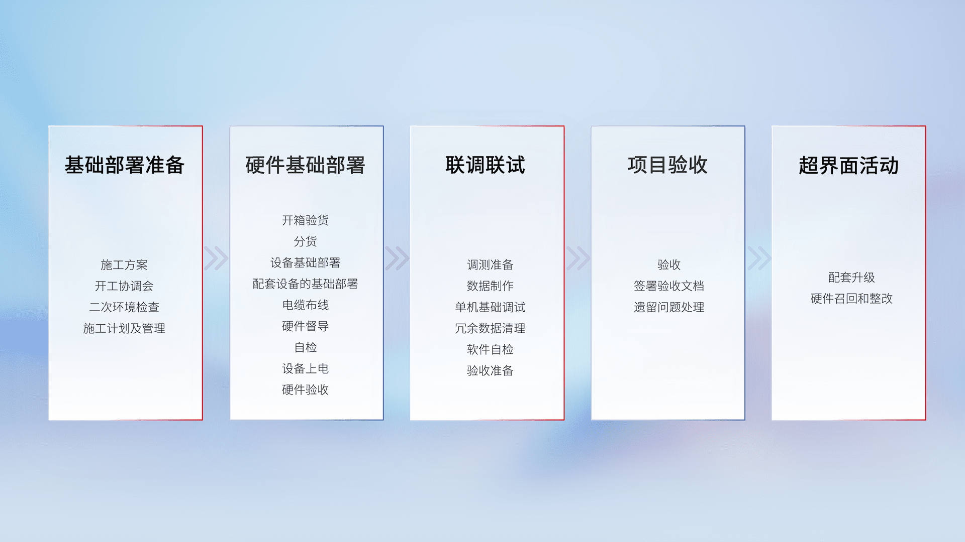 从基础部署准备、、、硬件基础部署、、、联调联试、、项目验收、、、、越界面活动的全过程可追溯,,保证施工质量和进度。。。。